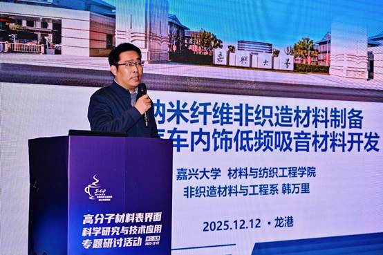 ? 嘉興大學(xué)副教授韓萬里在主題為“微納米纖維非織造材料制備及其汽車內(nèi)飾吸音材料開發(fā)”的報告中介紹,團隊圍繞微納米纖維非織造材料制備及汽車內(nèi)飾低頻吸音材料開發(fā)展開研究,通過熔噴、液噴、網(wǎng)格誘導(dǎo)均質(zhì)湍流紡絲等多種規(guī)?;苽浼夹g(shù),利用氣流場與聚合物射流的耦合作用調(diào)控纖維形態(tài),成功開發(fā)出納米纖維、木棉纖維復(fù)合吸音材料,在汽車發(fā)動機3000轉(zhuǎn)工況下可實現(xiàn)17.9dB的降噪效果(優(yōu)于市售材料的11.7dB),且材料輕量化(比傳統(tǒng)材料輕15%-30%),兼具吸音、環(huán)保優(yōu)勢,已獲20 余項發(fā)明專利授權(quán),可廣泛應(yīng)用于汽車內(nèi)飾、建筑隔音等領(lǐng)域。