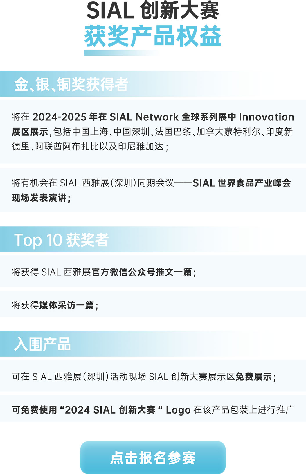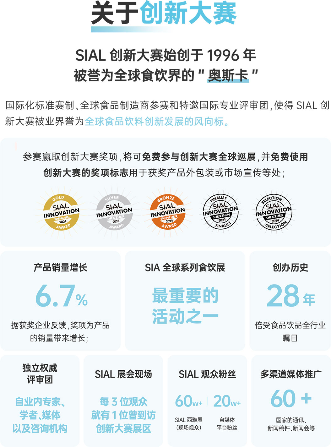 秉承決選出為消費者帶來切實利益的創新產品的原則,以及圍繞愉悅、健康、保健、便捷、環保五大維度,來自業內專家、學者、媒體以及咨詢機構等專業人士組成的獨立權威評審團對參賽產品進行篩選。 報名產品數500+,最終35件產品入圍,獲得金銀銅獎項的產品將在2024-2025年度SIAL全球巡展創新大賽展區進行展出。