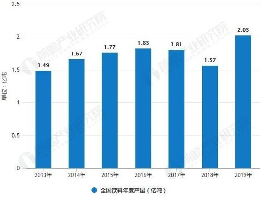 當前,龐大的中國飲料市場依舊保持增長,據前瞻產業研究院發布的《中國軟飲料行業產銷需求與投資預測分析報告》統計數據,截止至2018年底,全國飲料產量為15679.2萬噸,同比增長6.9%。預測2019年中國飲料市場將保持增長,產量將突破2億噸,達到2.03億噸。