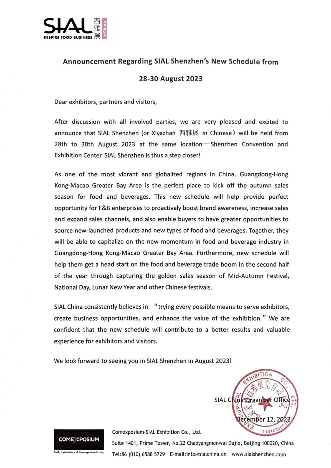 經過與各方協調,我們很高興甚至很激動地宣布:SIAL西雅國際食品和飲料展覽會(深圳)——音譯中文簡稱:SIAL西雅展(深圳),將定檔于2023年8月28日至30日舉辦,地點仍在深圳會展中心(福田)。SIAL西雅展(深圳)距離與大家的見面又更近了一步。